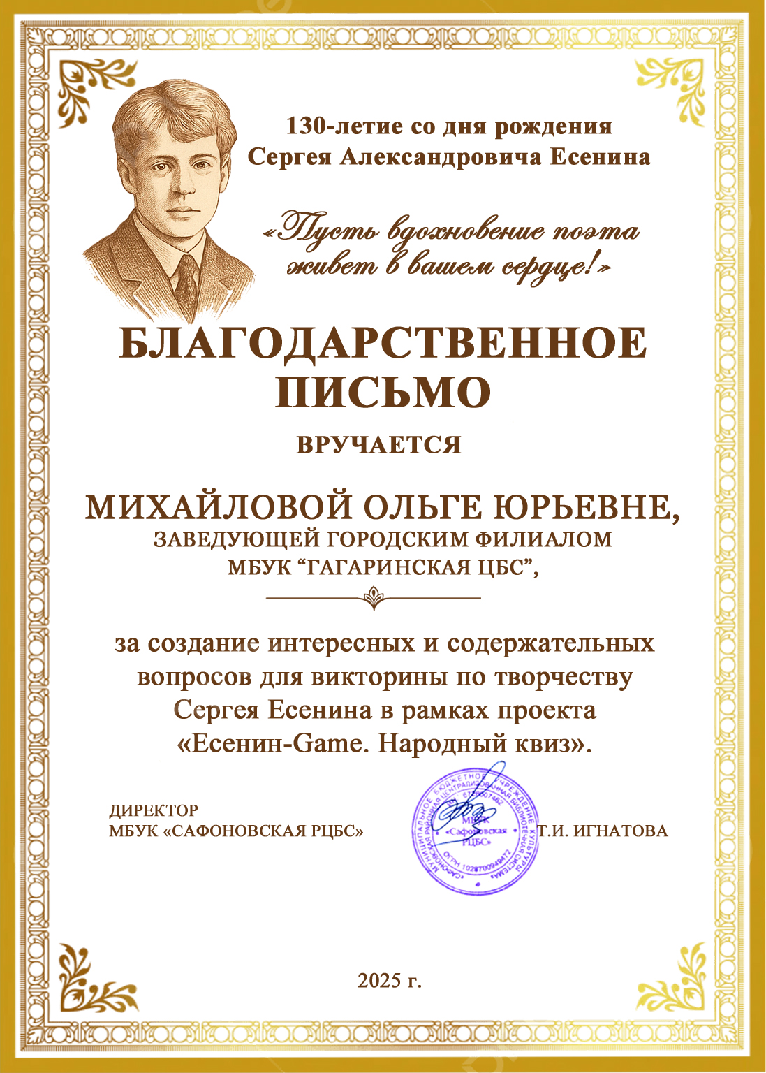 Городской филиал МБУК «Гагаринская ЦБС» принял участие в подготовке проекта «Есенин-Game. Народный квиз», инициированном Центральной районной библиотекой города Сафонова Смоленской области. Он был посвящен творчеству юбиляра 2025 года – великому русскому поэту Сергею Александровичу Есенину (1895-1925).