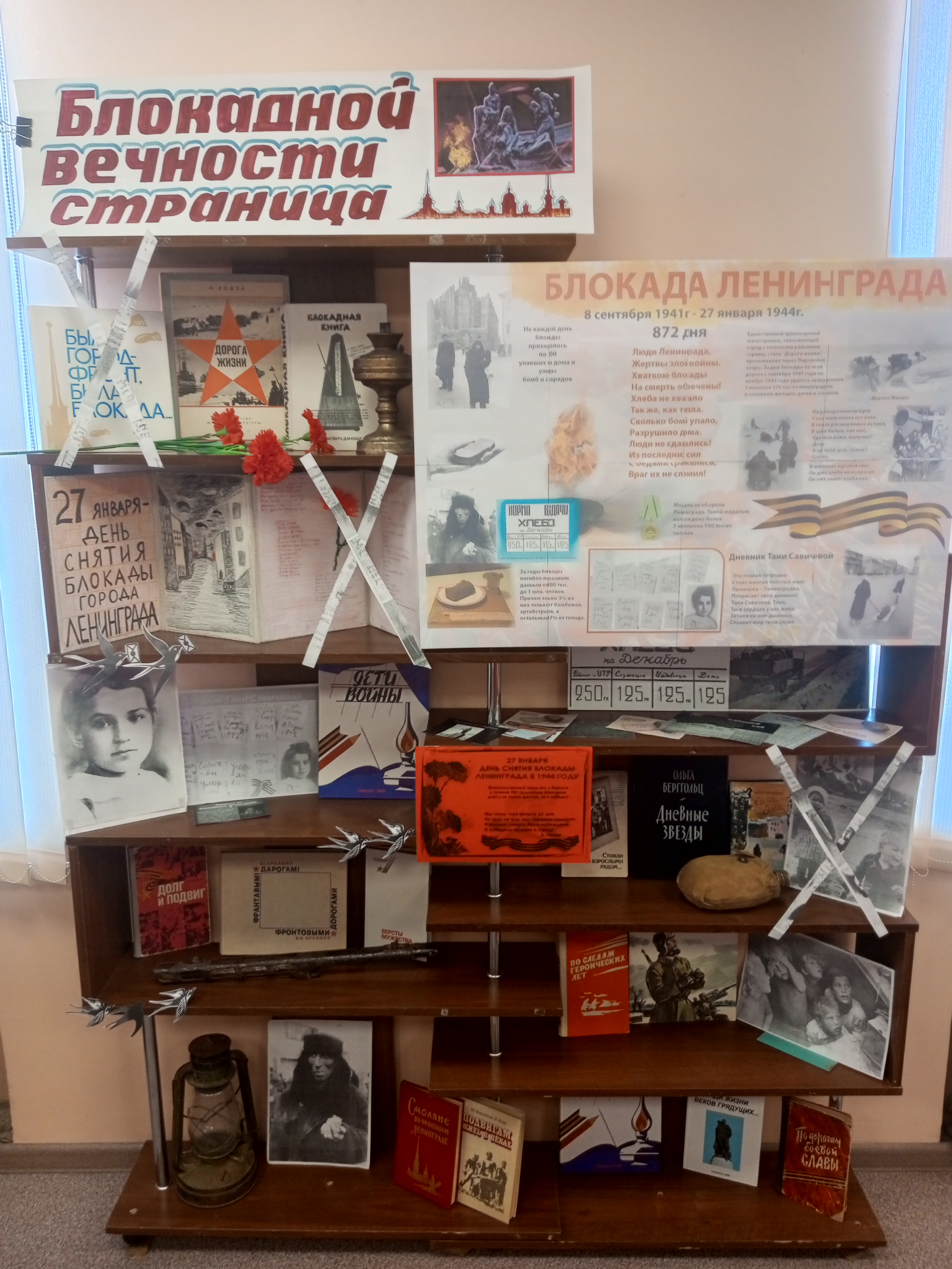 Была оформлена выставка-летопись «Блокадной вечности страница», с которой могли ознакомиться участники мероприятий и все желающие в течение недели; подготовлен информационный буклет «Жизнь, деленная на граммы».