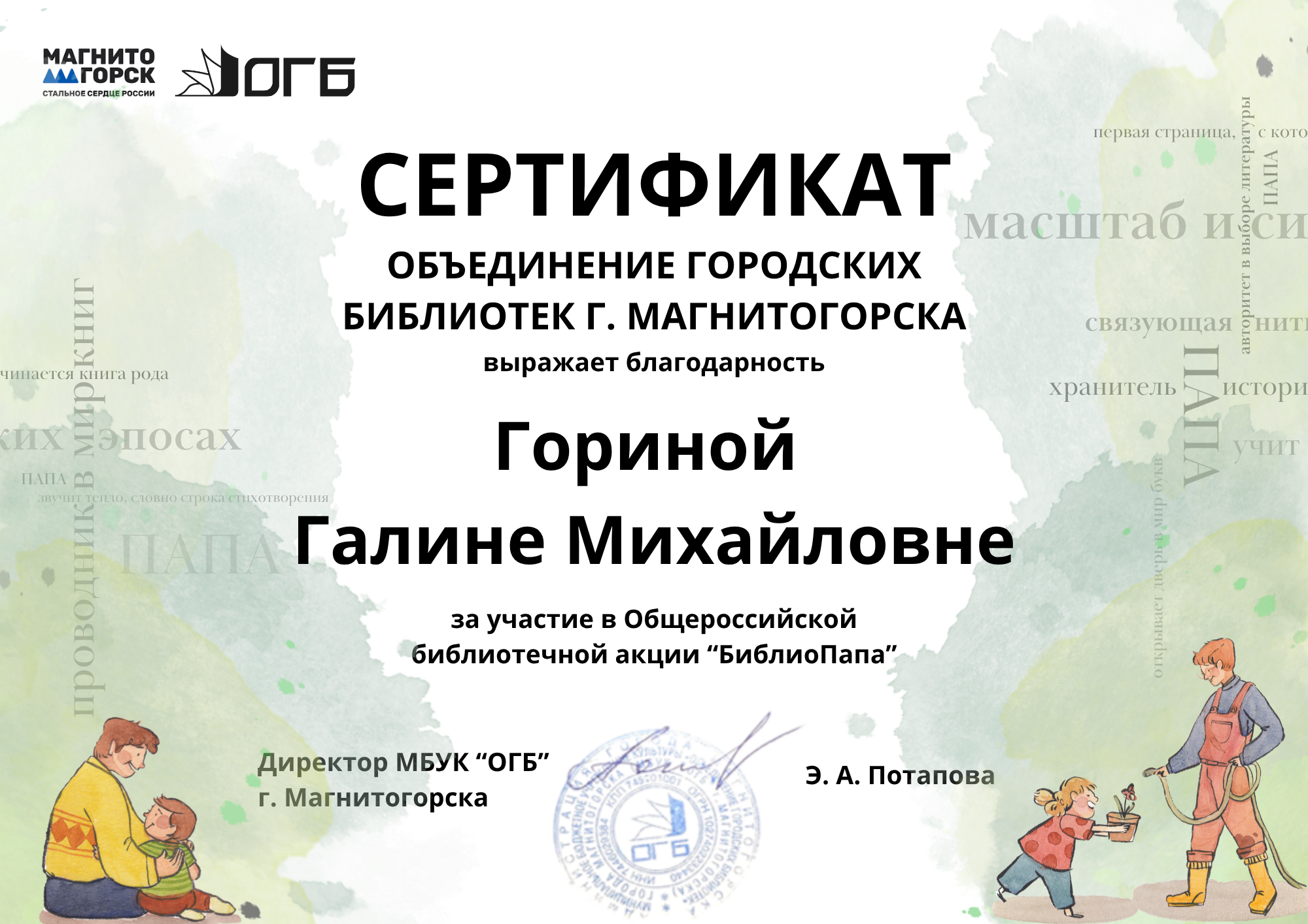 Центральной детской библиотеке за участие в акции «БиблиПапа» был вручен Сертификат.