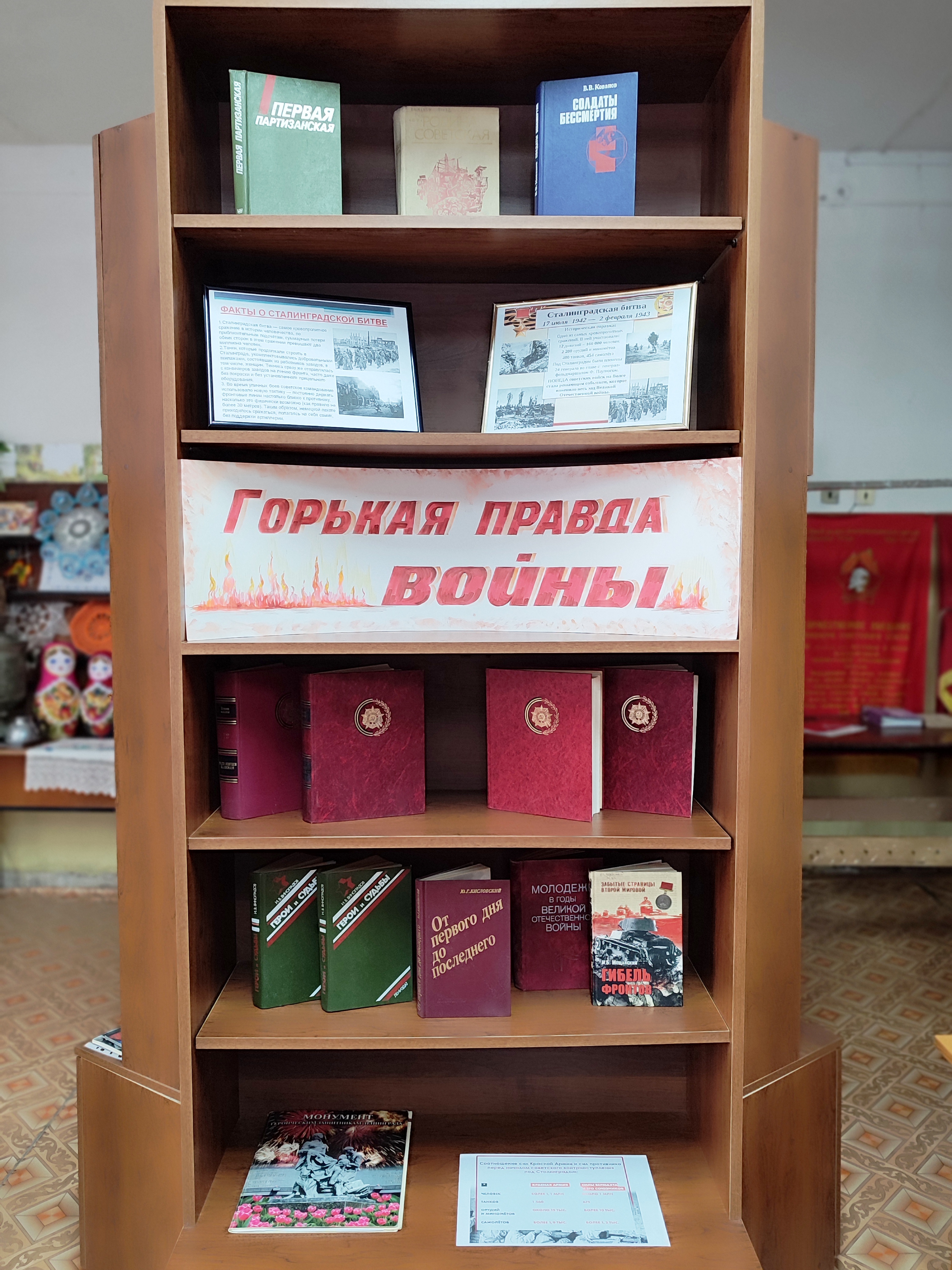 Вниманию читателей была оформлена книжная выставка «Горькая правда войны», на которой были представлены книги, повествующие о событиях, которые происходили в Сталинграде в 1942-1943 годах. Это биографические повествования о прославленных советских военачальниках и военно-исторические очерки. Присутствовало на мероприятии 14 человек.