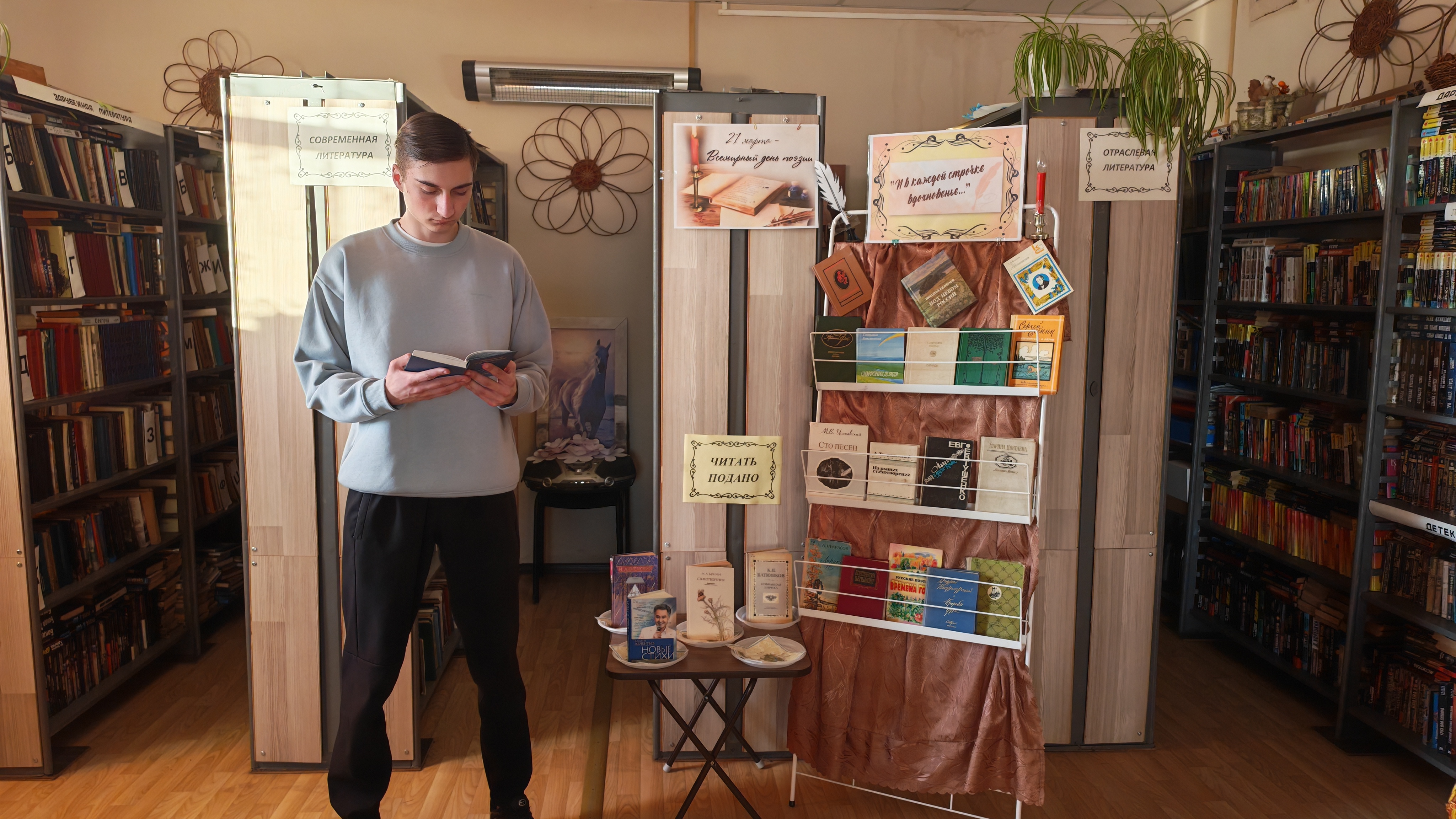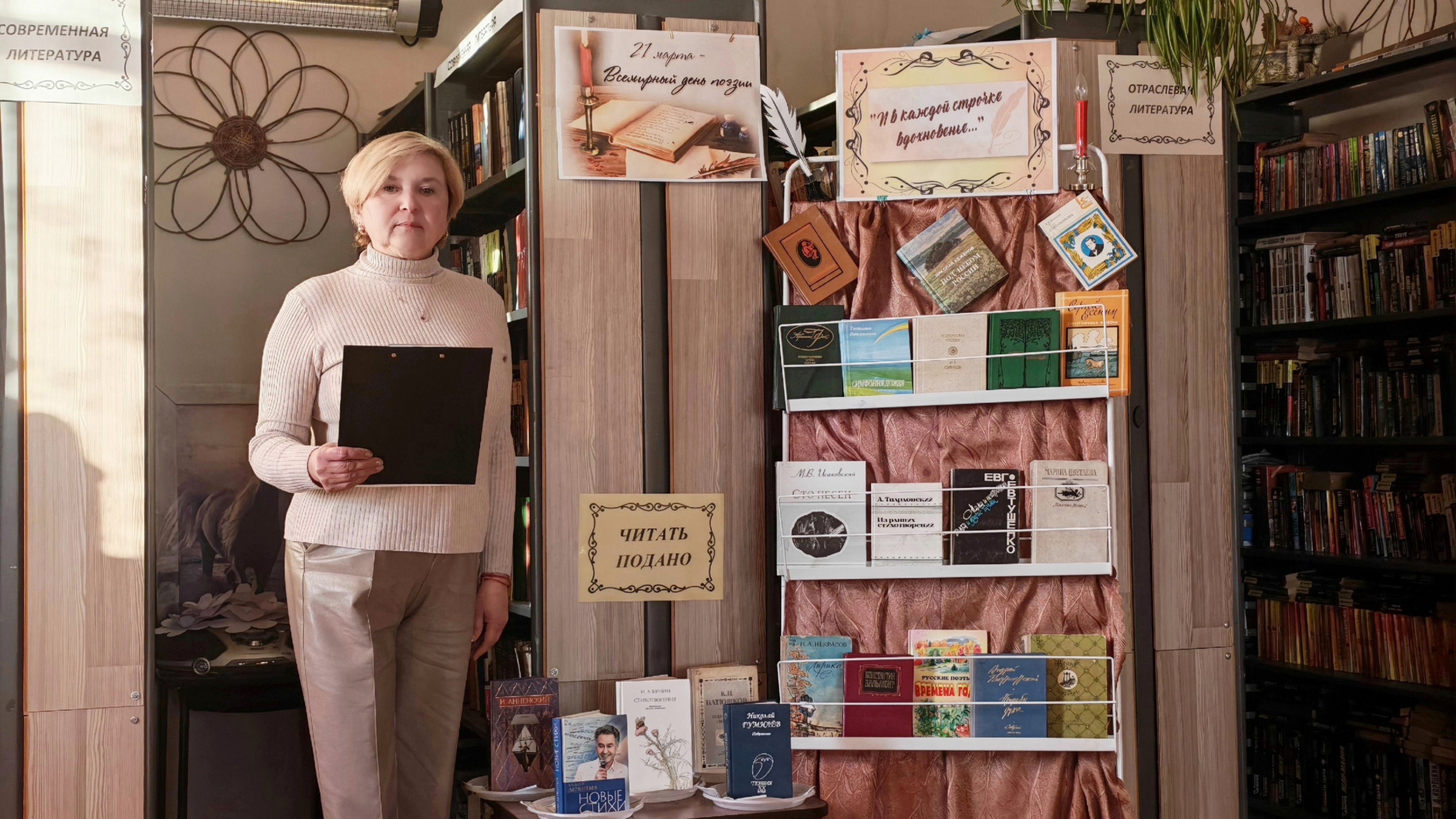 Ведущая рассказала о происхождении слова «поэзия», об истории возникновения этого дня, уходящего своими корнями в далёкое прошлое, о том, как в Древней Греции передавали поэтическое воображение через рисунки, звуки и движение тела. Познакомились с выставкой лирического настроения «И в каждой строчке вдохновенье…» представленной поэтическими произведениями. На стилизованном столике «Читать подано» можно было выбрать «поэтическое блюдо» и насладиться им – прочитав любое стихотворение предложенного автора. Гости выбирали и  читали стихи А. Дементьева, Л. Рубальской, Б. Окуджавы, а так же классиков русской литературы – Тютчева Ф.И. , Фета А.А., Кольцова А.В., Майкова А.Н., И. Бунина и многих других.