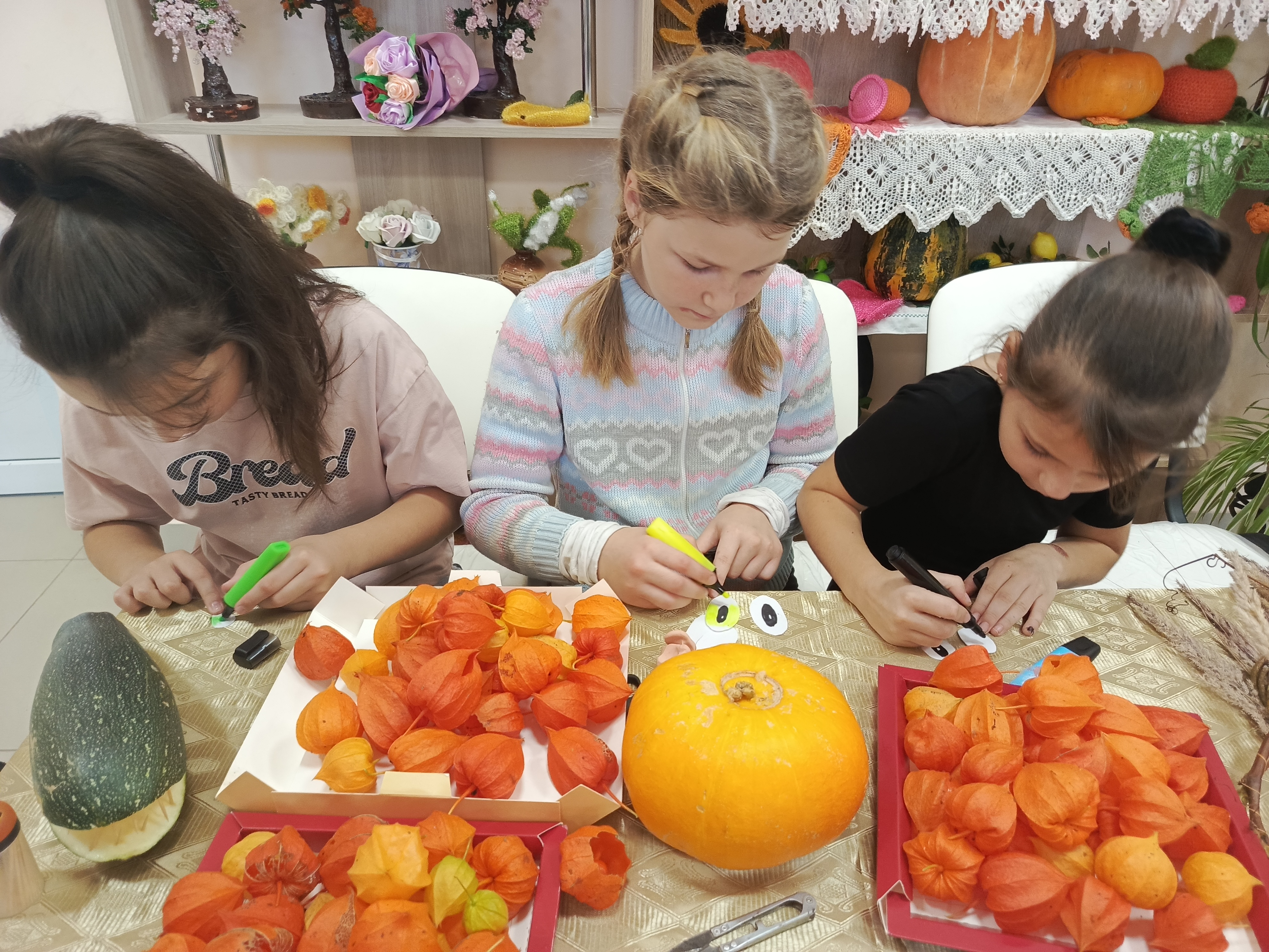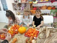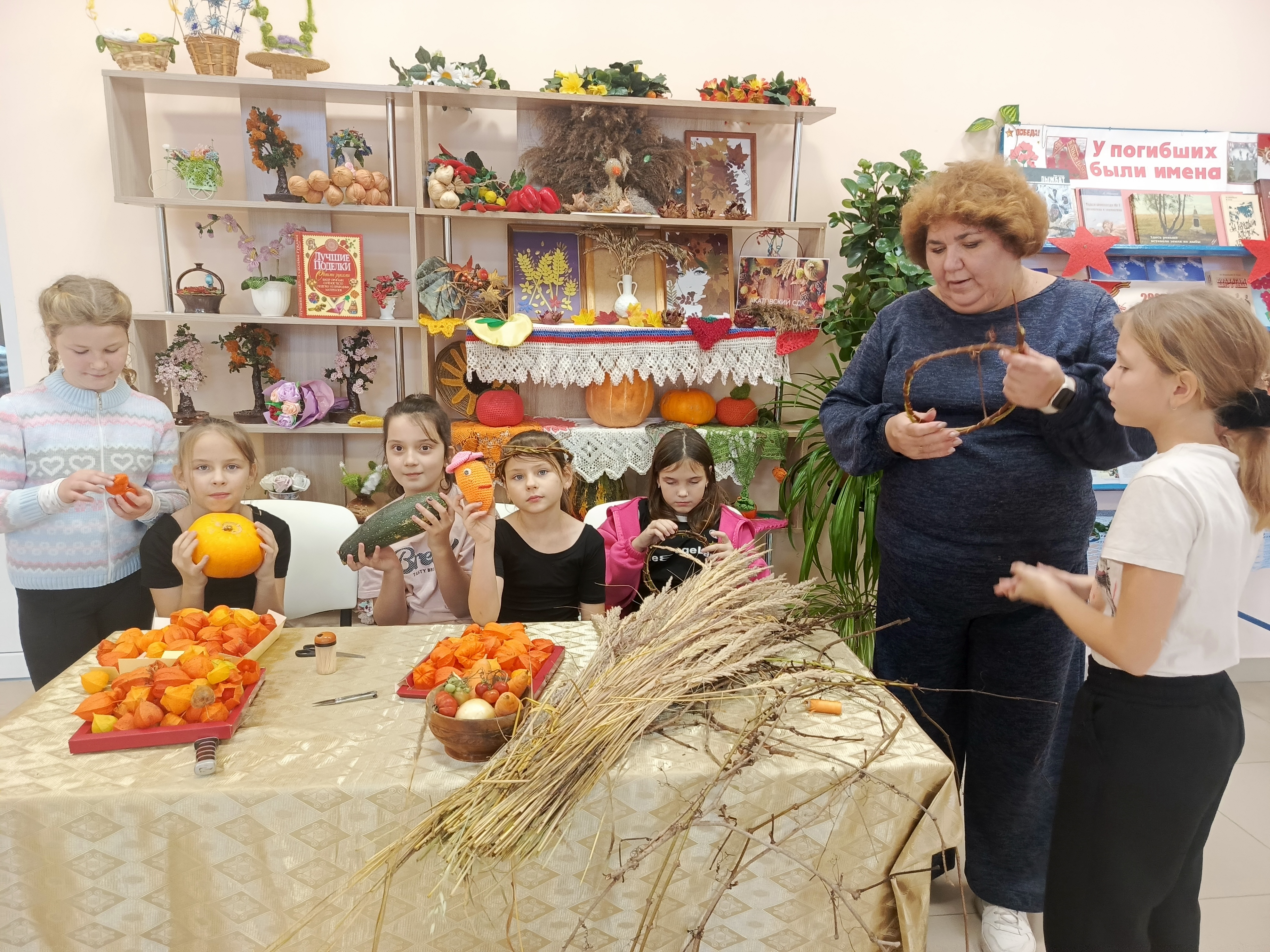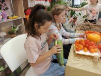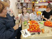 7 ноября 2025 года в Акатовском сельском филиале совместно с сельским Домом Культуры прошли занятия в творческой мастерской «Осенние дары для поделок и игры» (6+). Для занятий были приготовлены овощи: яркая оранжевая тыква, головка лука, морковь, помидоры, кабачок. Руководители занятий предложили детям пофантазировать и смастерить сказочных героев. Дополнительным материалом для творчества послужила сухая трава, зубочистки, бумага и фломастеры. Дружно закипела работа, маленькие фантазёры вырезали из бумаги глазки, разукрашивали их и крепили зубочистками к тыкве и луку. Овощи, словно оживали, превращаясь в Чиполлино и синьора Помидора. Из кабачка получился кит, из моркови - улитка. Яркий физалис и ветки сухой травы украсили венок, сплетённый из веток дикого винограда. Из готовых поделок была оформлена выставка творческих работ «Осенние фантазии».
